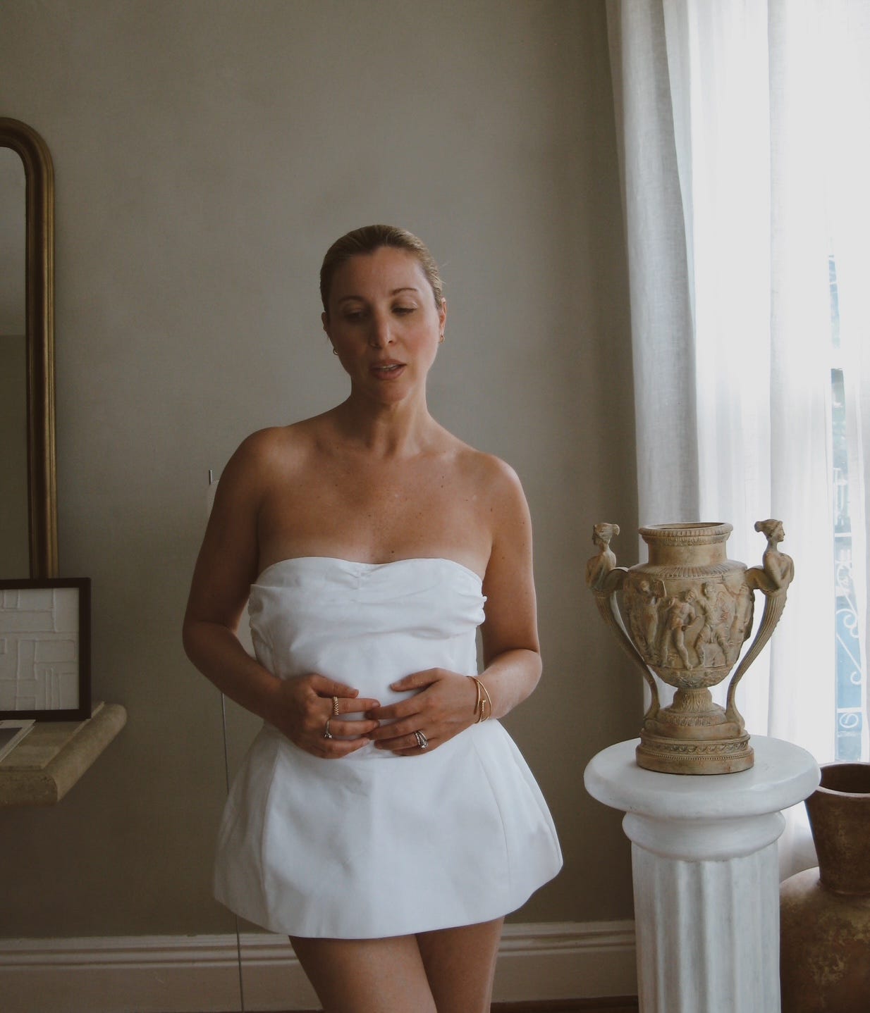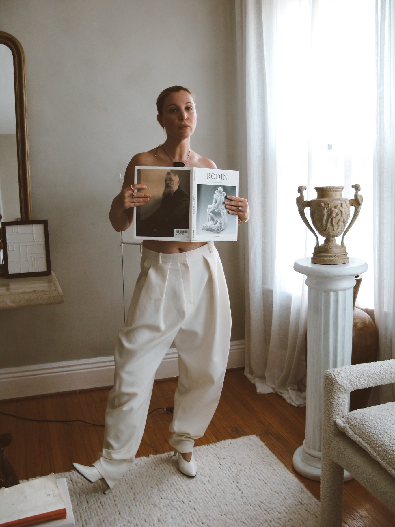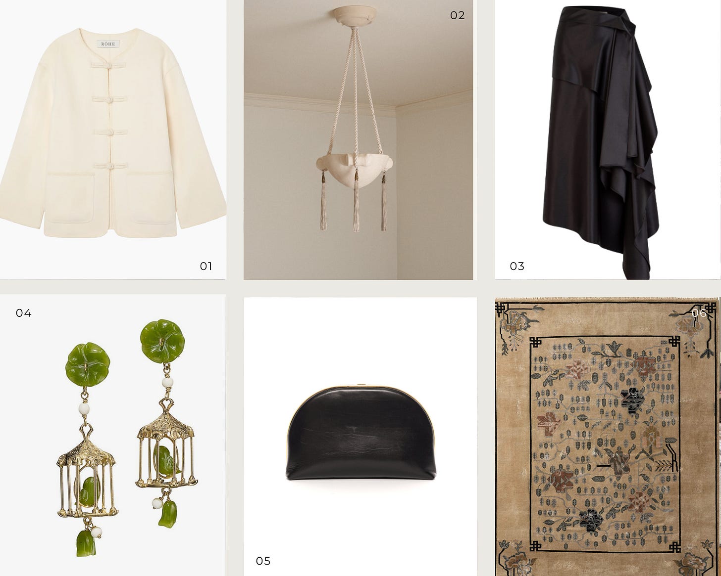 Rohé jacket. CB2 rug, Henri II light, Of Rare Origin Earrings, Heirlome skirt, The Row bag.