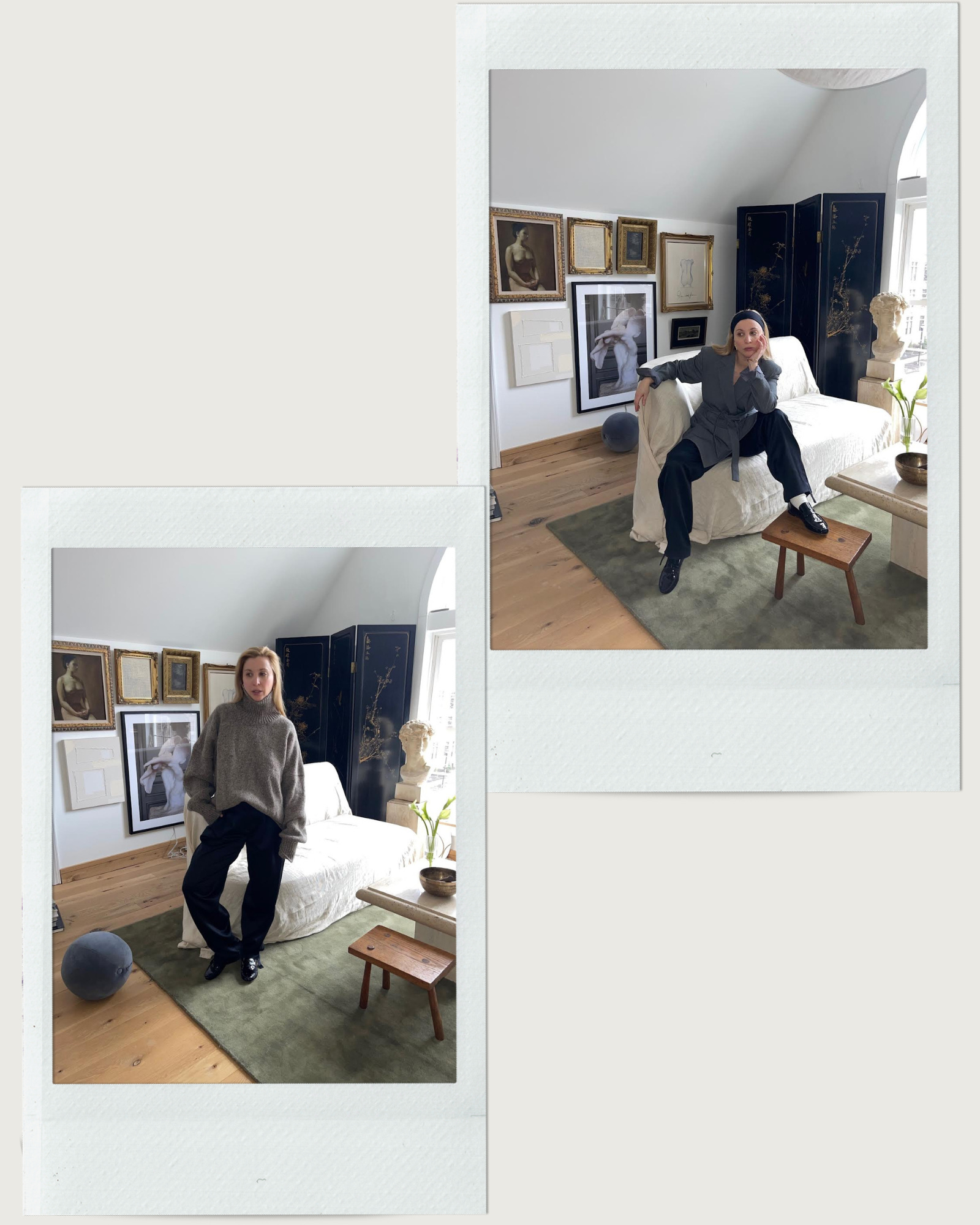 These are the same Magda Butrym silk pants styled for work (if you’re still an office girlie) with a gray Aritzia blazer and for a casual day look with a Babaa sweater, both with Jamie Haller shiny penny loafer shoes. It creates interest and makes pretty straightforward looks a little more unexpected.