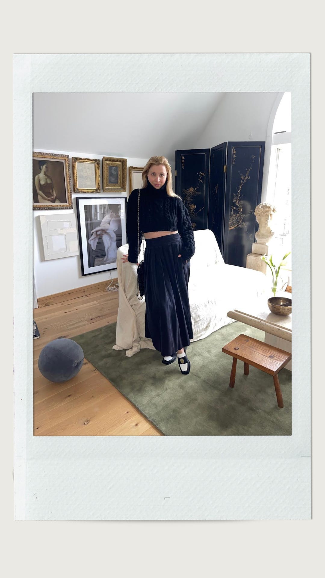 This is a vintage silk faille skirt I bought recently, worn with a Frankie Shop cropped sweater (here’s similar from Gauge81), Nomasei shoes, and a Prada bag. It’s feminine but not girlie!