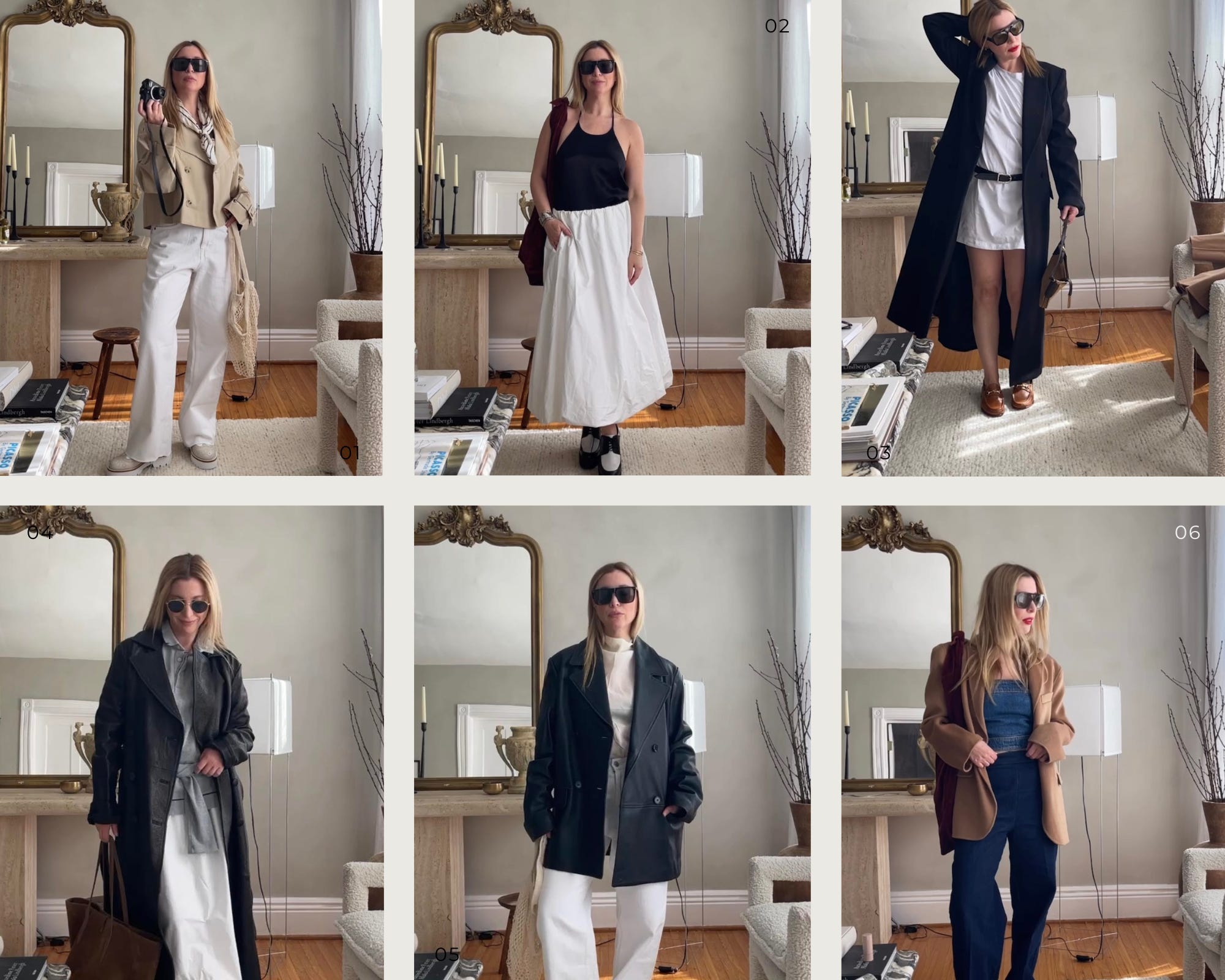 Onto getting dressed. Layering makes life more interesting, and Spring and Fall are your times to embrace it. My key pieces are various types of peacoats (cropped trenches, leather trenches, and long black jackets), a long white skirt (do the bubble if you’re so bold), baggy white jeans, sailor jeans, and various tops like a polo and sleeveless turtleneck. I’m into the t-shirt dress again. Belts and scarves make life more interesting and I just love loafers. I’ve been shopping my closet for old favorites like Celine platform loafers and an old The Row hobo bag in burgundy suede. The over-under on all the looks is “simple but not boring.” Play with different lengths and proportions (like a long jacket over a mini dress or a cropped trench with baggy jeans—mine are men’s and they give that Phoebe Philo white jeans vibe without the price tag). Here is the link to shop every piece.